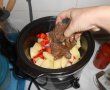 Mai intai am taiat carnea in bucatele le-am spalat, le-am uscat cu un servet si apoi le-am pus sa se caleasca cca 15 min. Separat am curatat legumele si le-am taiat mai grosier, asa cu barda... Am scos carnea si am condimentat-o, apoi am pus in recipientul slow cooker Crock-Pot un pic de ulei, am adaugat legumele si un praf de sare, am amestecat ,am asezat si bucatile de carne, peste care am turnat sucul de rosii, am clatit sticluta de suc de rosii cu apa si am turnat si apa peste carne. Am amestecat, am pus capacul si am activat functia high pentru cateva ore bune, nu le mai stiu numarul, ca am avut treaba. Important este sa fie gata cand vine ''seful'' acasa.....Gata...asteptam verdictul...de mirosit, miroase bine ....:)))))))