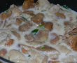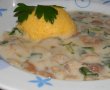 -Prajiti foarte usor in ulei ceapa si usturoiul taiate marunt , adaugati faina amestecand si incorporati laptele . Se va forma un sos in care puneti si buretii.