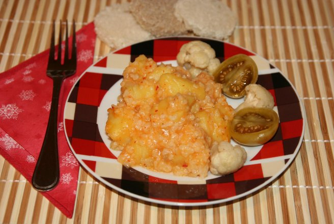 Punem si cartofii curatati, spalati si taiati cubulete, apoi orezul, ardeiul taiat mic, apa si lasam pe foc pana este fiert orezul.