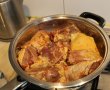 - Portionam puiul. Eu am avut pui de casa si am facut pulpele doar pe care le-am taiat potrivit de mari. Se spala si se sterg cu un servet de hartie apoi se condimenteaza cu sare, piper si pasta de ardei rosu . Stropim cu putin vin alb , zdrobim 2 catei de usturoi si dam la rece cca 4 ore (sau se pune in marinata cu o zi inainte- eu asa am facut)