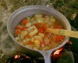 Incingem un foc pe pietre sau la gratar, dupa care punem legumele intr-un tuci, adaugam apa cat sa le acopere si le punem pe minunatul foc.