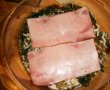 Dupa ce ati copt clatitele incepeti montarea tortului. Se pregateste un vas adanc termorezistent sau o forma de tort. Se pune prima clatita, se rade cascaval si se presara ciupercutele, alt clatita, cascaval rasa, sunca, alta clatita, cascaval ras, ciupercute. Tot asa pana se termina ingredientele. La sfarsit se amesteca smantana cu cele doua oua si se rastoarna peste tort. Se pune la cuptor cca. 10 minute. dupa ce s-a racit se rastoarna pe un platou si se orneaza dupa gust.