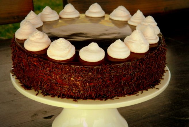 punem pe foc mediu smantana si cand a dat a dat in clocot adaugam ciocolata si amestecam pana se topeste si adaugam mierea.Lasam 5 minute la frigider pana se ingroasa putin.Glazura o intindem apoi pe tot tortul(asezat pe un gratar sau o tava) incepand din mijloc inspre margini.Dupa ce l-am glazurat il punem pe platoul de servire si il decoram pe lateral cu ornamentele de ciocolata iar deasupra cu ajutorul unui pos, il decoram cu frisca batuta .