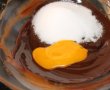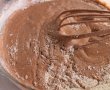 Mixam ouale si galbenusul cu mierea de albine pana se ingroasa apoi adaugam cate putin zaharul si continuam sa maxam pana se albeste si pare ca o budinca. Adaugam pasta de cacao in doua etape si omogenizam bine. Faina si praful de copt cernute le incorporam la fel, in doua etape, amestecand cu telul usor la suprafata si continuand cu o spatula, cu miscari de jos in sus pana la omogenizare. Batem de doua-trei ori castronul de masa pentru a scoate bulele de aer mai mari.