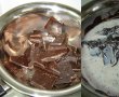 Ciocolata si frisca se topesc la bain-marie, se racesc putin si ungem cu un strat generos blatul, punem al 2 lea blat si finisam cu restul de crema.