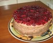 Acum, eu am avut un pachet de visine congelate, pe care le-am lasat la dezghetat, le-am presarat cu 2-3 linguri cu zahar si le-am lasat la scurs pe perioada cat am preparat tortul. Le-am asezat apoi deasupra tortului si am turnat o gelatina rosie peste ele (la pliculet, preparata dupa instructiunile de pe pachet).