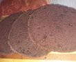 Pentru blat: mixam albusurile spuma cu 150 g zahar. Mixam galbenusurile spuma cu restul de zahar. Adaugam uleiul treptat peste galbenusuri si mixam sa se incorporeze bine. Apa fiarta o adaugam peste cacao si o amestecam bine sa nu ramana cocoloase. Adaugam si cacao peste galbenusuri si apoi treptat faina cu praful de copt. Amestecam usor compozitia de galbenusuri peste cea de albusuri si amestecam usor cu o spatula. Turnam compozitia in tava tapetata cu hartie de copt. Eu am pus doar jumatate si am copt 2 blaturi.