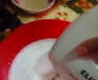 Batem frisca tare si incepem sa adaugam putin cate putin din crema care am lasat-o la rece pana o adaugam pe toata in crema si mixam bine pana ce aceasta s-a incorporat bine in frisca.