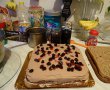 Crema de ciocolata : Aceasta crema am preparat-o in doua etape, o etapa seara cand am facut si blaturile si a doua etapa a doua zi cand am asamblat tortul. Intr-un castron de inox am pus ciocolata, am adaugat frisca lichida si smantana de frisca si siropul de cirese amare, am pus castronul pe baie de abur. Amastecam continuu pana ce se topeste ciocolata, atentie nu trebuie sa atinga punctul de fierbere. Se da la frigider pana a doua zi. A doua zi se pune in vasul mixerului si se mixeaza foarte bine, pana obtinem o crema spumoasa.