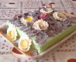 -Am tapetat o forma de tort dreptunghiulara cu margarina si foaie de copt,am turnat compozitia si am pus la cuptorul preincalzit la 170 grade pentru o ora aproape,verificand dupa 40 minute cu betisorul,cand iese curat este gata.Lasam la racit in tava.