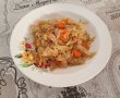 Dupa 10 minute se stoarce de zeama lasata si se pune in vasul de la slow cooker Crock-Pot impreuna cu ceapa taiata, morcovul rondele, ardeiul picant si condimentele.