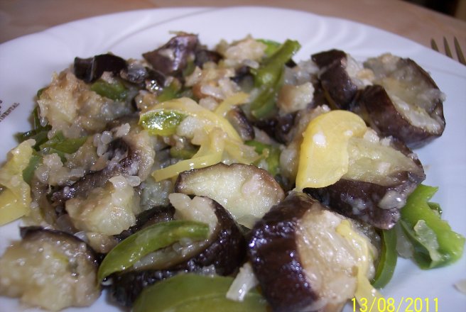 Separat, se taie ceapa marunt si se caleste in ulei. Se adauga ardeii taiati fasiute micute. Dupa cateva minute se adauga vinetele si usturoiul zdrobit. Se potriveste de sare si piper, se mai lasa putin si gata.