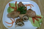 Carnea se taie in felii subtiri, se bate ca pentru snitele, se condimenteaza cu sare si piper.Intr-o tigaie se pune 1 lingurita ulei si se calesc ciupercile taiate pan se evapora toata apa.Se condimenteaza cu sare si piper si cand sau racit se adauga oul si 1 lingutita de pesmet ca sa se lege...