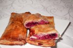 Intr-o cratita punem fructele, zaharul si apa, amestecam si punem pe foc pana ce devine un sos gros. Lasam sa se raceasca. Luam cate o foaie de placinta o ungem cu unt topit si racit, o indoim pe jumatate. In mijloc adaugam cate o lingura umplutura (nu punem foarte mult ca sa nu curga), indoim...