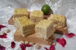 Intr-o cratita, amestecam faina cu zaharul, adaugam laptele caldut si galbenusurile. Amestecam continuu cu un tel pentru a nu se forma cocoloase. Punem pe foc, amestecand continuu pana ce se ingroasa ca o budinca. Stingem focul, adaugam zeama, coaja rasa de lime, esenta, amestecam bine,...