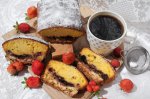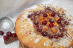 Intr-un bol batem ouale cu sare, zaharul, adaugam iaurtul, branza de vaci. Amestecam bine, adaugam esenta, coaja de lamaie si zeama, uleiul, adaugam faina pana rezulta o compozitie mai groasa (decat cel de caltite clasice). Se imparte in 2 si in fiecare adaugam cirese (spalate si fara...
