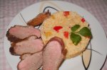 Pieptul de rata il scoatem de la frigider cu o ora inainte sa il pregatim. Preseram sare pe partea cu carne,pe partea cu piele il crestam in forma de romburi(eu nu m-am complicat ca era prea multa munca si nu taia cutitu bine:)) )eu doar l-am crestat pentru a permite grasimii sa se scurga....