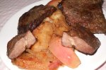 Ficatul il spalam,il curatam de pielita si il taiem felii,il stergem cu un prosop de bucatarie, Intr-o tigaie topim 50 g unt sau ulei,si prajim feliile pana se rumesc putin, Spalam merele,le scoatem cotorul si le taiem felii,le stropim cu zeama de lamaie, Intr-o tigaie adaugam restul de...