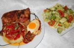 Pulpele de pui le spalam bine le condimentam cu sare si le prajim in putin ulei (cat sa se rumeasca putin) Le asezam intr-o tava (unsa cu ulei sau tapetata cu hartie) acoperim cu folia alimentara, Cat se prajesc pulpele curatam ceapa, ardeii si taiem solzisori, In uleiul in care am...
