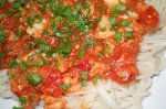 Prajim pestele dupa care il scoatem pe un servetel absorbant Curatam rosiile de coaja si le taiem cubulete Intr-o tigaie calim ceapa si adaugam usturoiul pisat, adaugam rosiile si dupa 5 min adaugam pestele taiat in bucati mici, Lasam sa fiarba cateva clocote si potrivim de sare si piper...