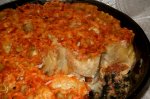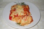 Sosul de rosii -intr-o tigaie adaugam usutoiul tocat si lasam sa se caleasca putin dupa care adaugam ceapa tocata si lasam sa se caleasca pana devine transparenta,adaugam rosiile tocate impreuna cu sucul,restul de ingrediente si lasam sa fiarba cateva min(cca 5 min).Adaugam sosul in tava unsa cu...